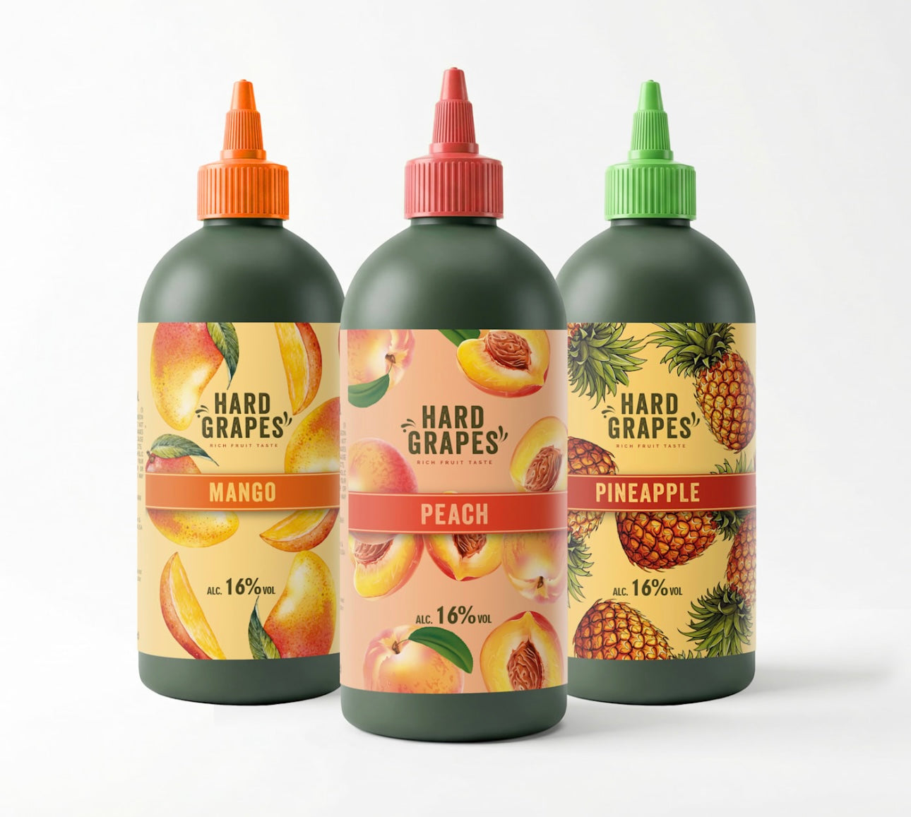 The Hard Grapes Squeeze Variety Pack is the ultimate way to experience all three flavors. This pack includes Peach, Mango, and Pineapple—each a bold, fruit-forward wine made at 16% alcohol and packaged in easy-to-use 500ml squeeze bottles.